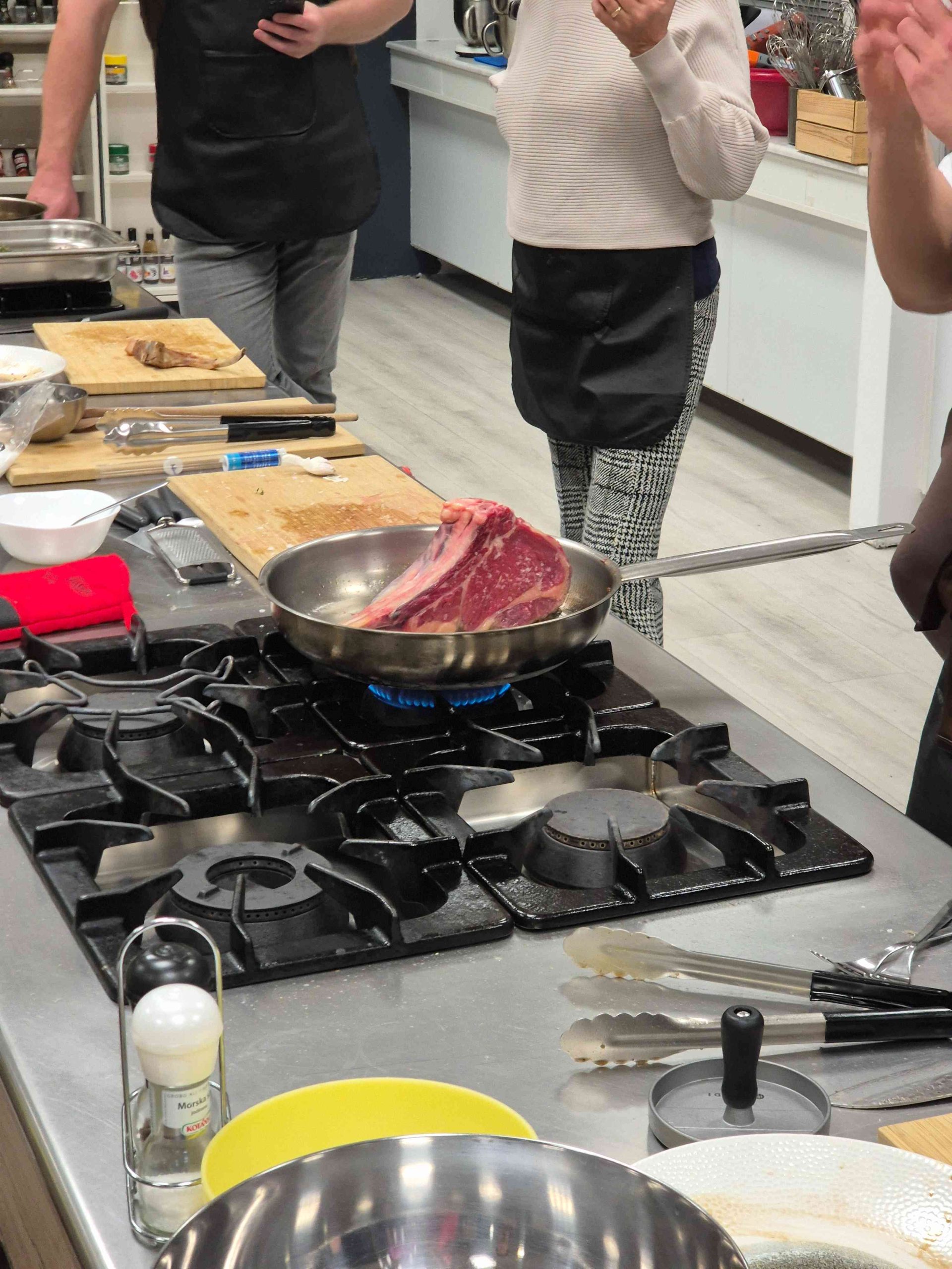 Sledil bo ribeye, odležan kos slovenske govedine, ki ga boste pripravljali v parih. Vrhunski chef Maj vam bo pokazal tudi pripravo cowboy steaka, kjer boste skupaj dosegli popolno aromo in postrežbo.